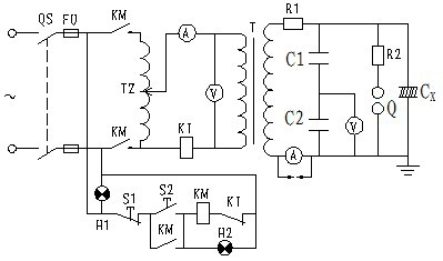 圖中KI為過電流繼電器,試驗過程中如被試設備絕緣擊穿,則過電流繼電器應動作,切斷試驗電源,避免損壞試驗設備;Q為球間隙,用于防止過電壓,試驗時一般調整為1.1~1.15倍的試驗電壓;R1為限流電阻,防止由于絕緣擊穿、放電時引起的大電流損壞高壓試驗變壓器;R2為阻尼電阻,防止由于球間隙放電引起的電壓振蕩。