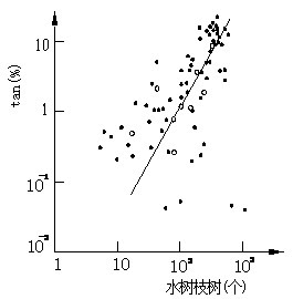 在對(duì)已運(yùn)行過(guò)的XLPE電纜進(jìn)行加速老化試驗(yàn),得出水樹(shù)枝發(fā)生的個(gè)數(shù)以及最長(zhǎng)的水樹(shù)枝長(zhǎng)度與電纜tan 測(cè)量值的關(guān)系,如圖1-8及圖1-9所示,它們的趨勢(shì)是明確的,但分散性很大。如將最長(zhǎng)的水樹(shù)枝長(zhǎng)度與每單位長(zhǎng)度電纜中的樹(shù)枝數(shù)的乘積作為橫坐標(biāo),則與測(cè)得的tanδ(縱坐標(biāo))之間具有更好的相關(guān)性,說(shuō)明測(cè)得的tanδ值取決于整體損耗的變化。